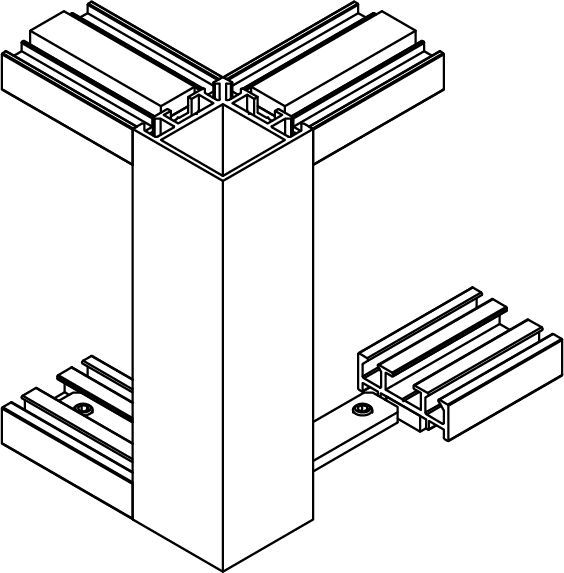 Aluminium 90° corner post with square design, assembled with angle brackets to the top and bottom rails.