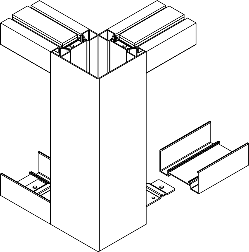 Poteau aluminium d’angle à 90 ° au design carré assemblé par équerres aux lisses hautes et basses.