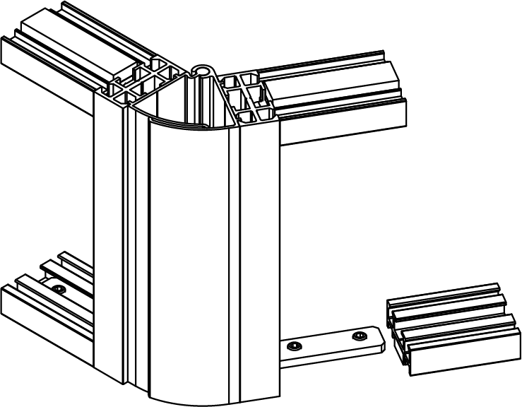 Poteau aluminium d’angle variable 2 departs assemblé par équerres aux lisses hautes et basses.