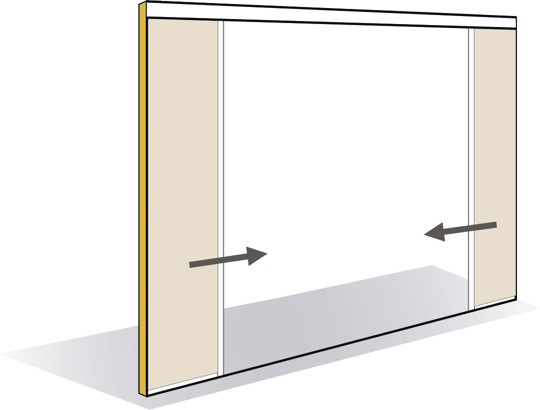 Ce module de passage toute hauteur pour porte coulissante double vantail en applique de la gamme AZ ESSENTIEL se construit à partir d’une structure en profilés aluminium assemblés par équerre. Des capots de finition clipsés sur les montants viennent habiller le chant intérieur du passage. Les portes bois ou cadre aluminium sont suspendues sur un rail coulissant caréné de largeur adaptée à la porte choisie.