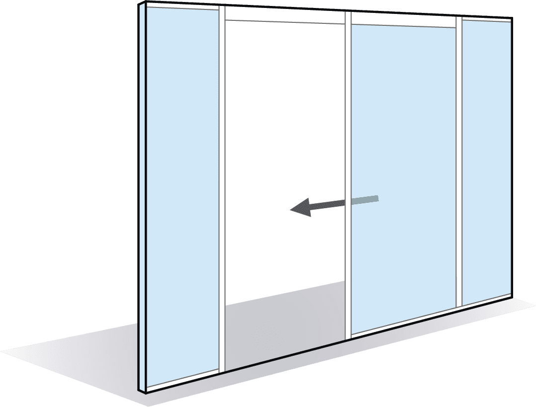 Ce module de passage pour porte coulissante simple vantail à galandage se construit à partir d’un rail coulissant intégré dans la cloison. La porte bois ou cadre aluminium suspendue s’efface à l’intérieur des modules adjacents.
