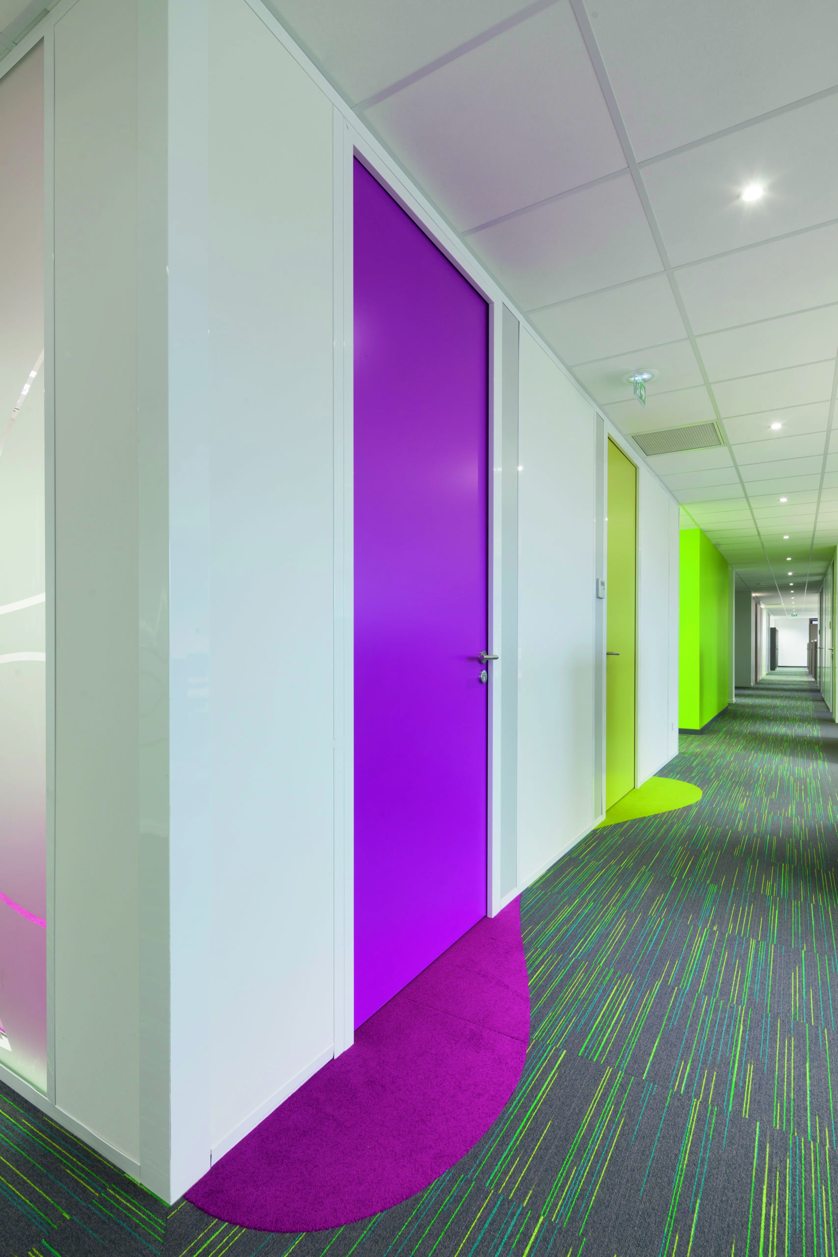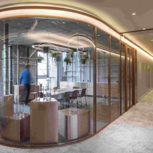 Parmi les demandes spécifiques du projet, on peut noter l’intégration de portes à galandage dans les cloisons vitrées, ce qui a permis de maximiser l’espace et de conserver la transparence souhaitée. De plus, les parties cintrées avec vitrage bombé ont ajouté une touche d’élégance à l’espace.